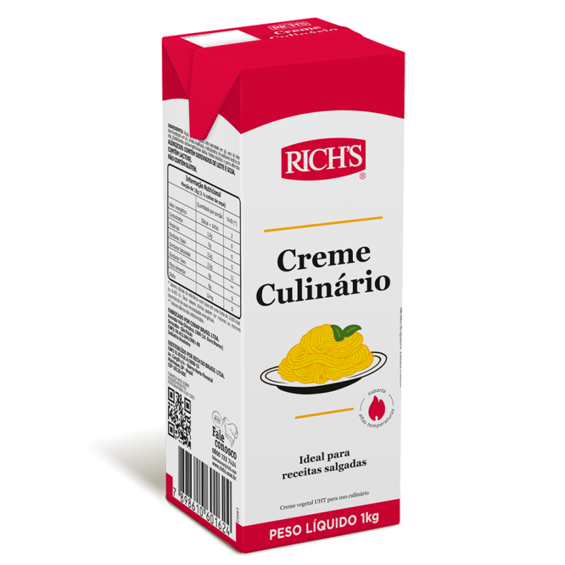 O Creme Culinário Rich's é ideal para receitas salgadas e seu uso simplifica a produção, minimiza o custo do alimento, diminui erros e aumenta a versatilidade de suas receitas. Todos esses benefícios proporcionam maior rapidez durante as preparações e ganho financeiro. Não possui glúten, gordura trans e suporta altas temperaturas.