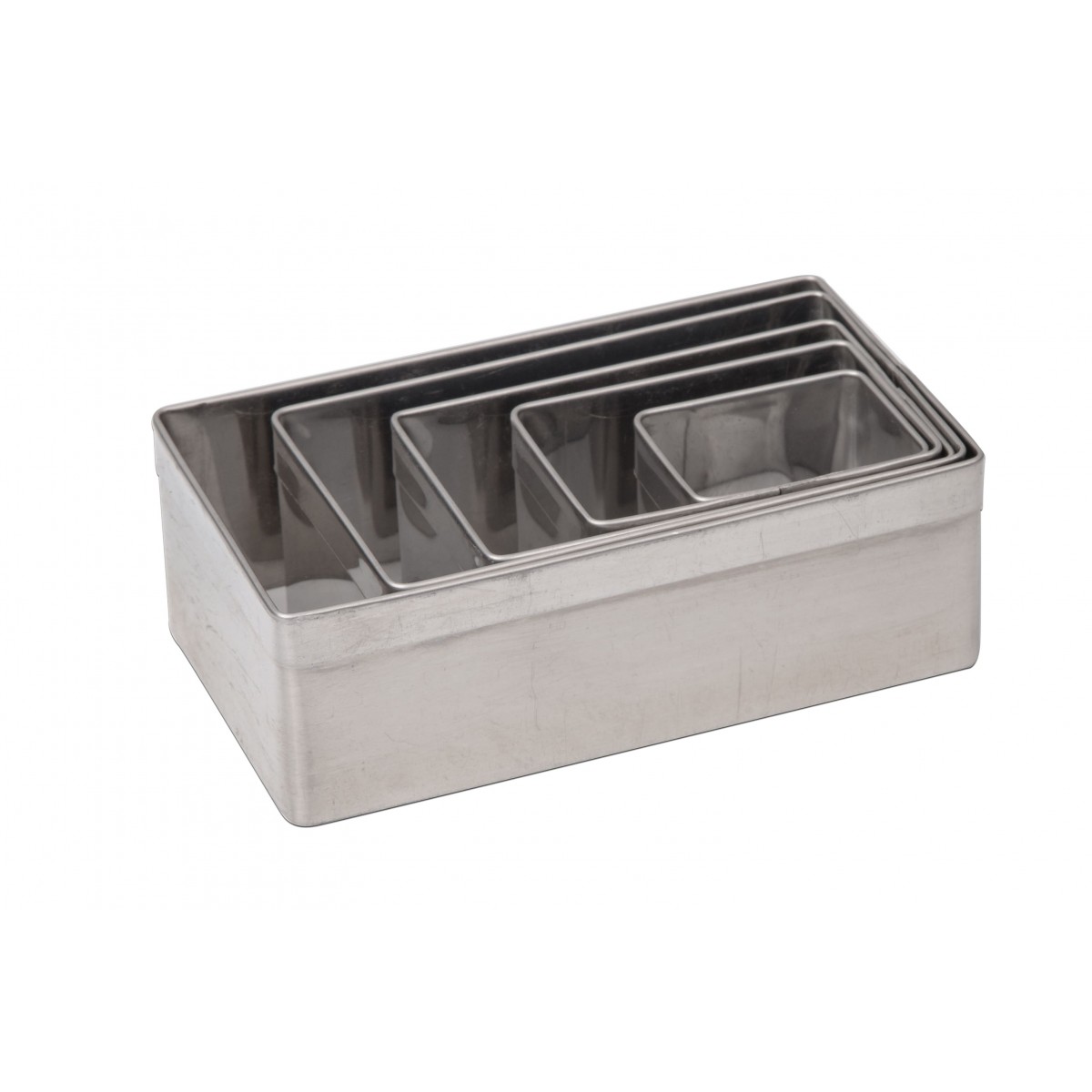 Jogo de cortadores de Retangulo, com tamanhos variados, essencias para confeccionar, doces e salgados. Exemplos de utilização: decoração em Pasta Americana, biscoitos, bases de chocolates, torradas decoradas, artesanatos (biscuits), entre outros. Usando a criatividade, em decorações de bolos e tortas, na Panificação, confeitaria e uso doméstico.